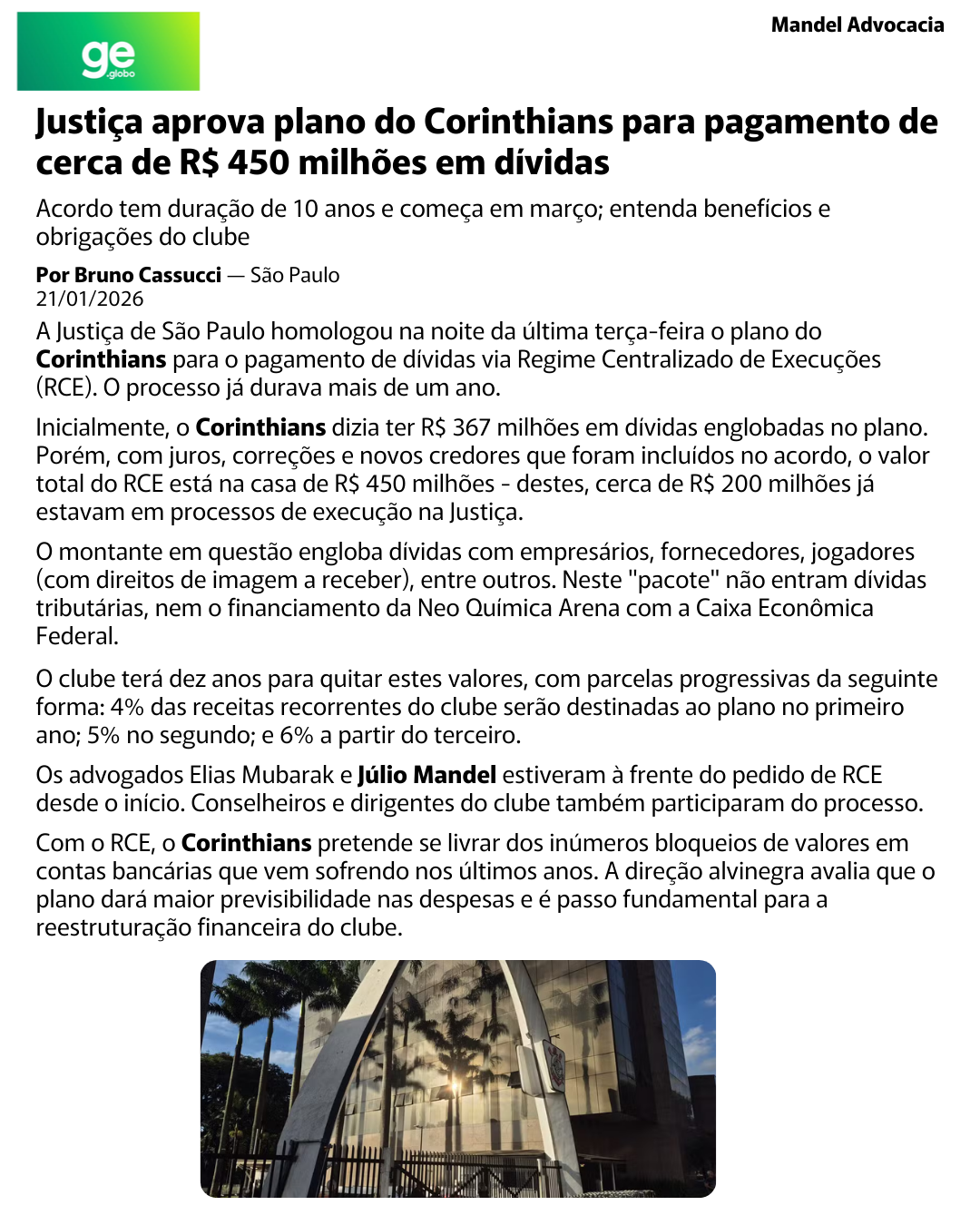 Justiça aprova plano do Corinthians para pagamento de cerca de R$ 450 milhões em dívidas – GE / Globo